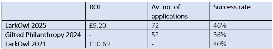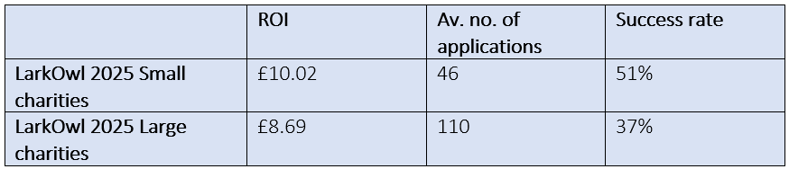 Larger organisations are sending more than double the number of applications. This represents a different strategic approach - more applications to more funders which are likely less targeted.